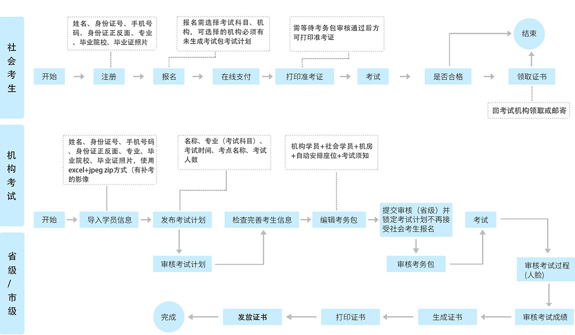 智慧考試系統(tǒng)主要是由考生端、考試端、機構(gòu)端、監(jiān)管端、管理端等組成,對線上考試進行綜合管理的系統(tǒng)平臺。該平臺將考生培訓、報名、繳費、考試安排、考務管理等考試流程信息統(tǒng)一管理,并從各個維度幫助企業(yè)立體化分析考生考試等數(shù)據(jù),極大提升了考試流程的規(guī)范化、標準化、信息化,提升了考試效率,提升了考生的考試體驗。